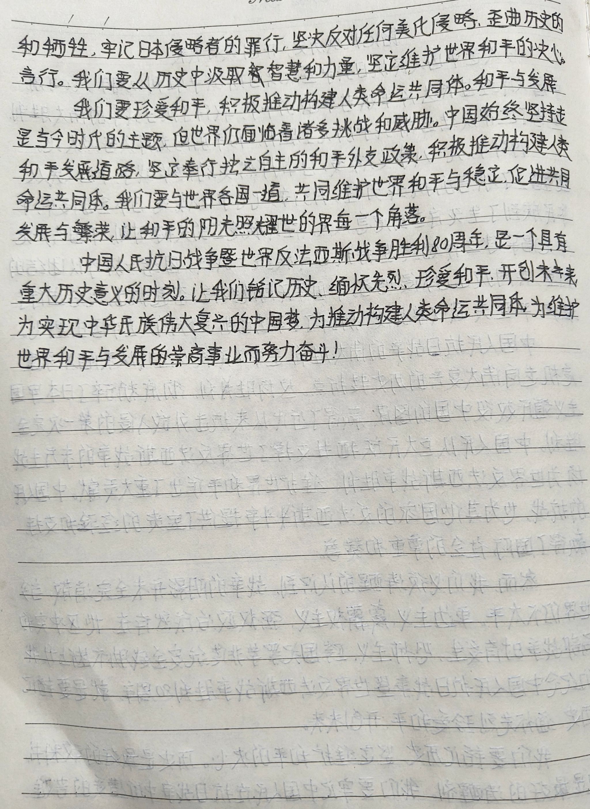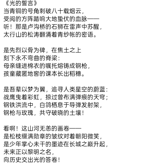 为铭记历史功勋,传承伟大抗战精神,引导青年学子从“九三阅兵”的震撼场景中汲取奋进力量,将爱国情怀与个人理想、校园生活紧密结合,365英国上市公司于9月3日至5日开展“九三阅兵”主题创作活动,号召全体同学以笔为媒,抒发对历史的敬畏、对未来的期许。