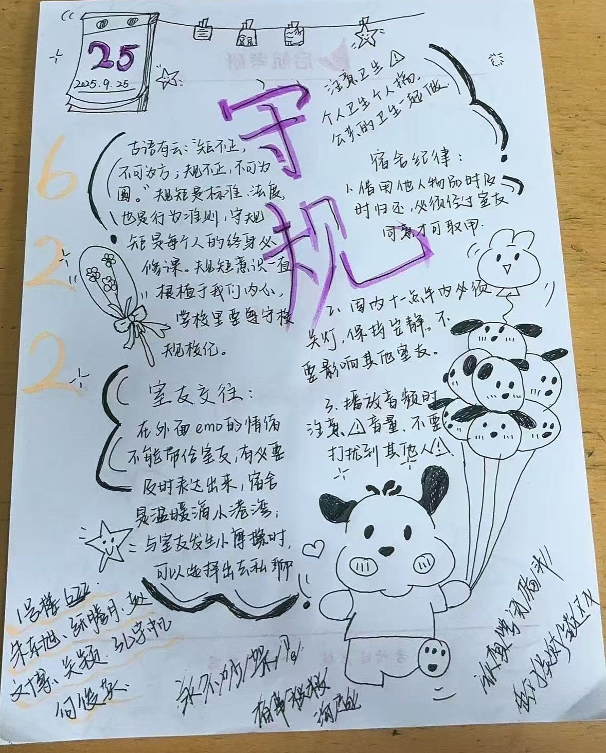 本次活动旨在通过宿舍成员共同商讨、制定适合本宿舍的行为规范,明确作息时间、卫生值日、物品摆放及公共物品使用等方面的要求,进一步增进室友之间的沟通与理解,促进彼此包容,化解潜在矛盾,营造融洽和睦的生活氛围。活动期间,各宿舍成员踊跃参与,积极发表意见,共同拟定具有宿舍特色、务实可行的文明公约。许多宿舍不仅制定了文字公约,还配套设计了值日表、公约签名墙等,增强了执行的仪式感和约束力。这一过程不仅深化了同学们对集体生活的认同,也锻炼了沟通协调与团队合作能力。