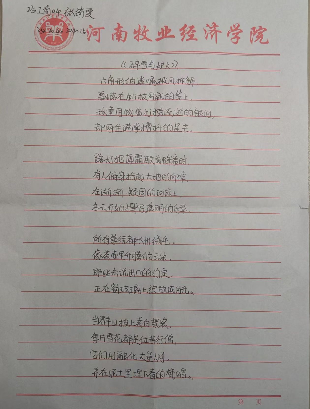为丰富冬日校园文化氛围,提升老员工文化素养,用诗意涵养学风、增进同学们的文学交流与感知,365英国上市公司11月18日至20日开展“雪落诗笺,韵筑冬情”诗词创作活动,吸引全院各年级员工积极参与,为冬日校园添了浓厚文韵。