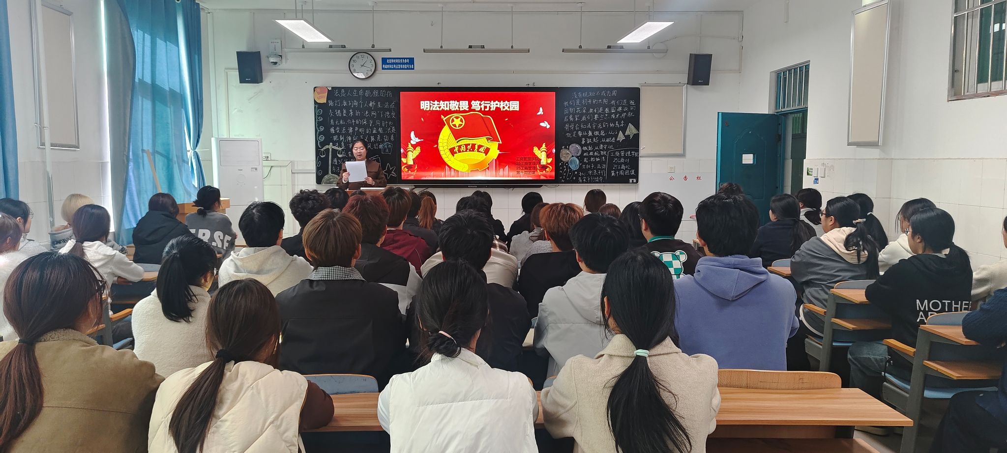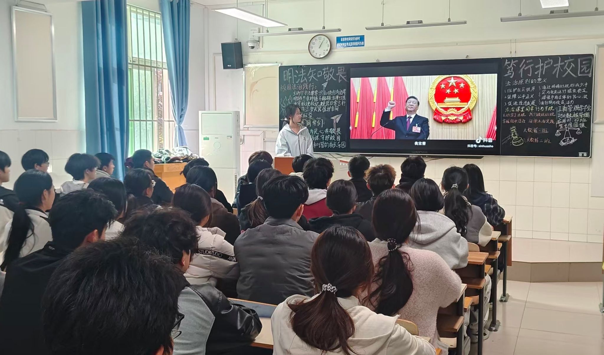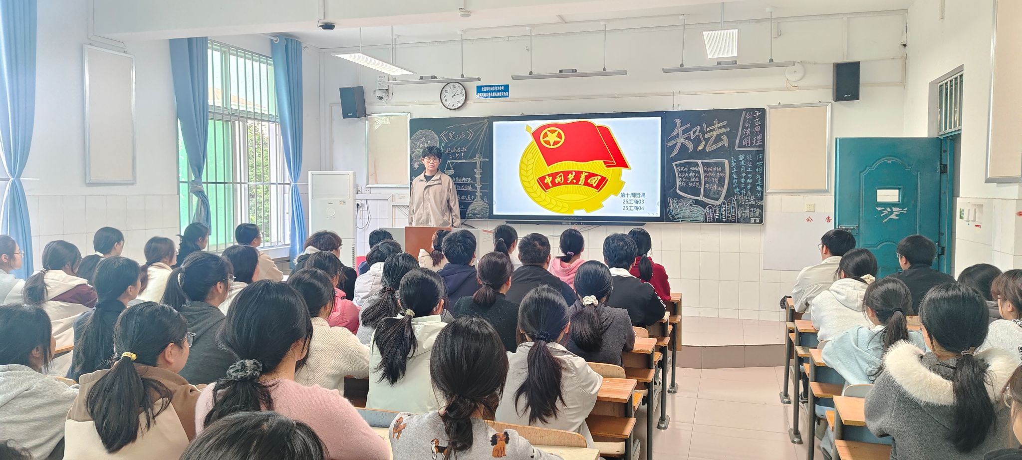 团课伊始,团支书通过播放法治宣传短片、展示实际案例图片等方式,直观且生动地呈现了法律法规在校园生活中的具体体现以及违反法律带来的严重后果。随后,同学们围绕“如何在校园生活中践行法治精神”展开了热烈讨论。大家结合自身经历,踊跃发言,讲述了自己在面对权益受损时,运用法律知识维护自身合法权益的过程,并提出要积极参与校园法治宣传活动,带动身边同学一起学法、守法、用法。团课最后,团支书作出总结,号召全体同学牢记法律底线,将法治观念融入日常学习和生活的点滴之中,从遵守校规校纪做起,积极传播法治正能量,为构建和谐校园、平安校园贡献自己的青春力量。同学们纷纷表示通过此次团课深刻认识到法治建设对于校园和谐稳定、个人成长发展的重要意义,未来将积极争做校园法治践行者与守护者。