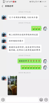 为支持公司的疫情防控工作,2019年2月17日,18营销(数据)二班的翟海利用奖学金委托老师购买了12副医学专用护目镜和1000双PE手套,合计1700元的防控物资捐赠给了校医院。面对来势汹汹的新病毒,她用自己的行动让人们看到了当代青年老员工的责任与担当。