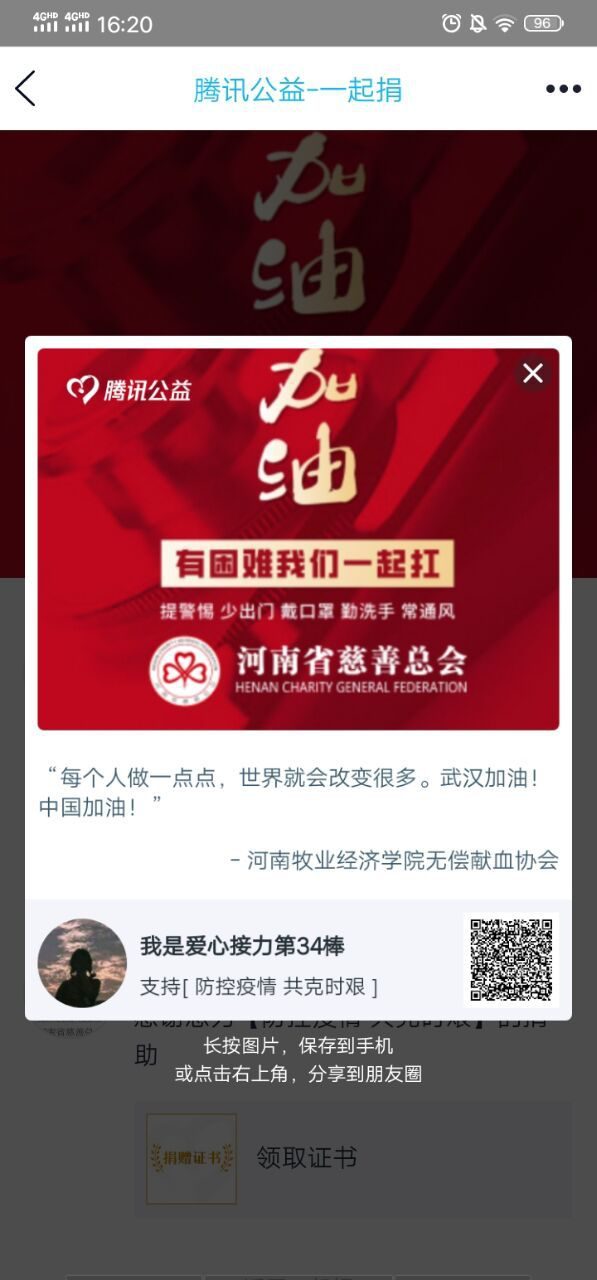 这次疫情不应只是“一些人”、“一类人的战斗,而应该是我们社会所有人的战场。抱着这样的信念,19工程造价二班的张梦歌,在2月17日,为支持社会的疫情防控工作,通过腾讯公益捐款八元,并号召同学参加捐款活动。星星之火,可以燎原,相信她的捐款接力终会化为一股细流,汇聚到战胜疫情的洪流中去。