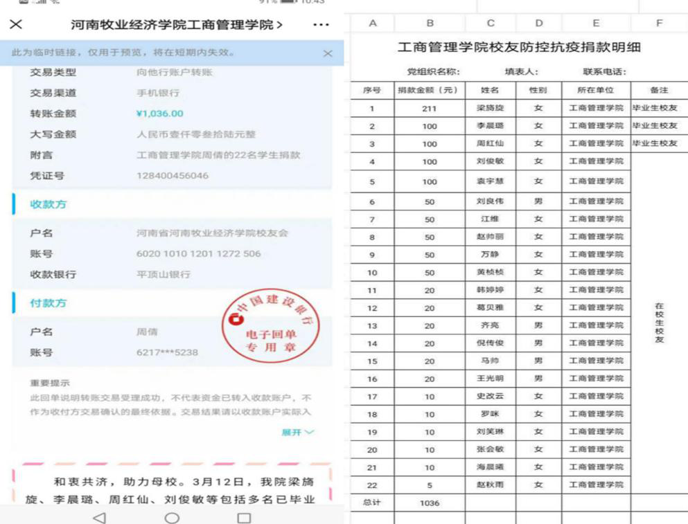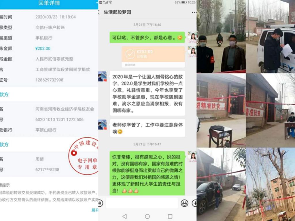 和衷共济,助力母校。3月12日,公司毕业生员工梁旖旋、李晨璐、周红仙和在校生员工刘俊敏、袁宇慧等22名同学,在得知校内防疫物资短缺后,主动请求向公司捐款,在校学子与毕业学子心系母校齐合力,一个个充满爱心与担当的红包纷纷涌入了公司爱心捐款的账号,共计1036元。“众人拾柴火焰高,相信每人都出一份力,我们一定能够打赢这场疫情防疫狙击战。”捐款学子如是说。病毒无情,人间有情,爱心捐款捐赠的不仅仅是金钱,更是公司学子们奉献母校的责任与担当!