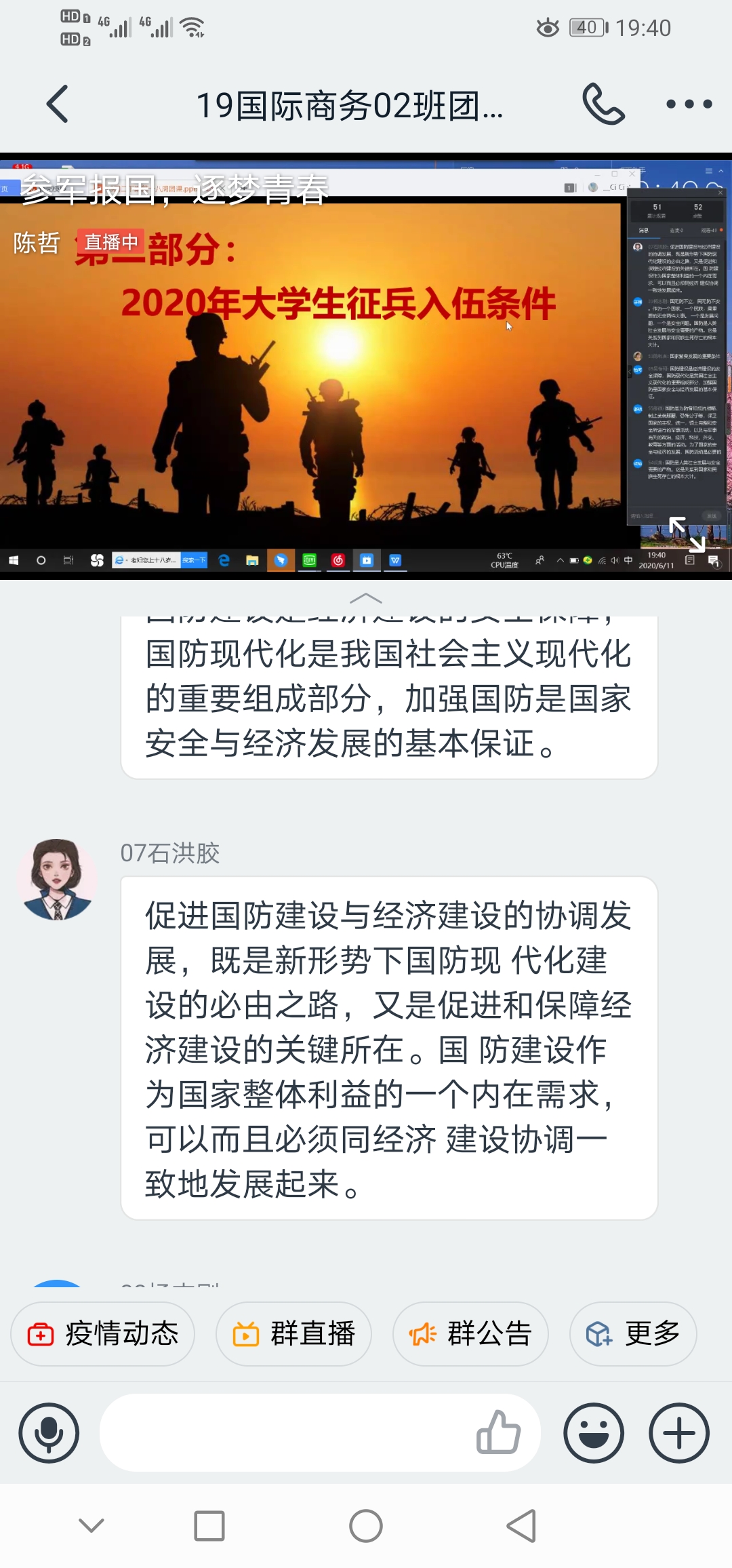 为贯彻落实国家征兵工作,鼓励员工积极参与应征入伍,提高兵员征集质量,推进国防和军队现代化建设。6月11日晚7点30分公司开展“参军报国,逐梦青春”线上主题团课。参加此次团课的有19级400余名员工。