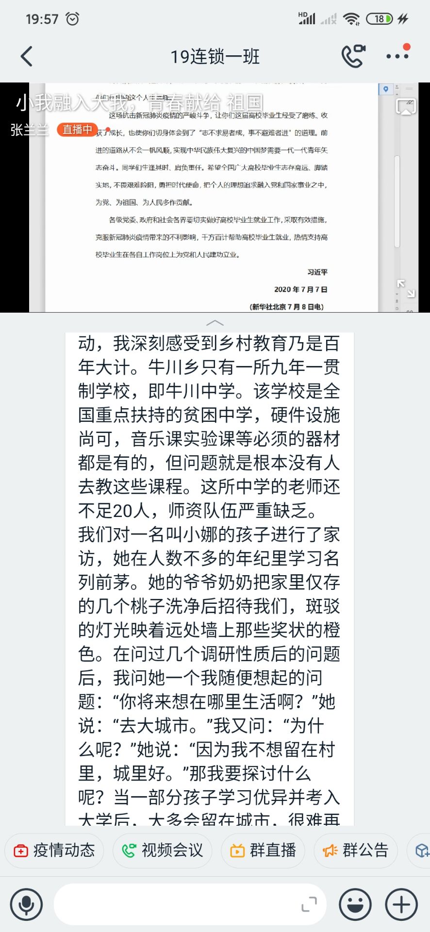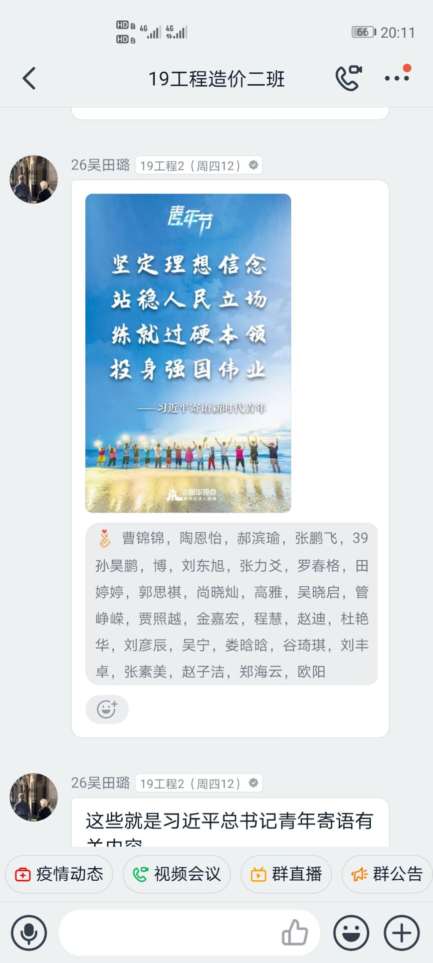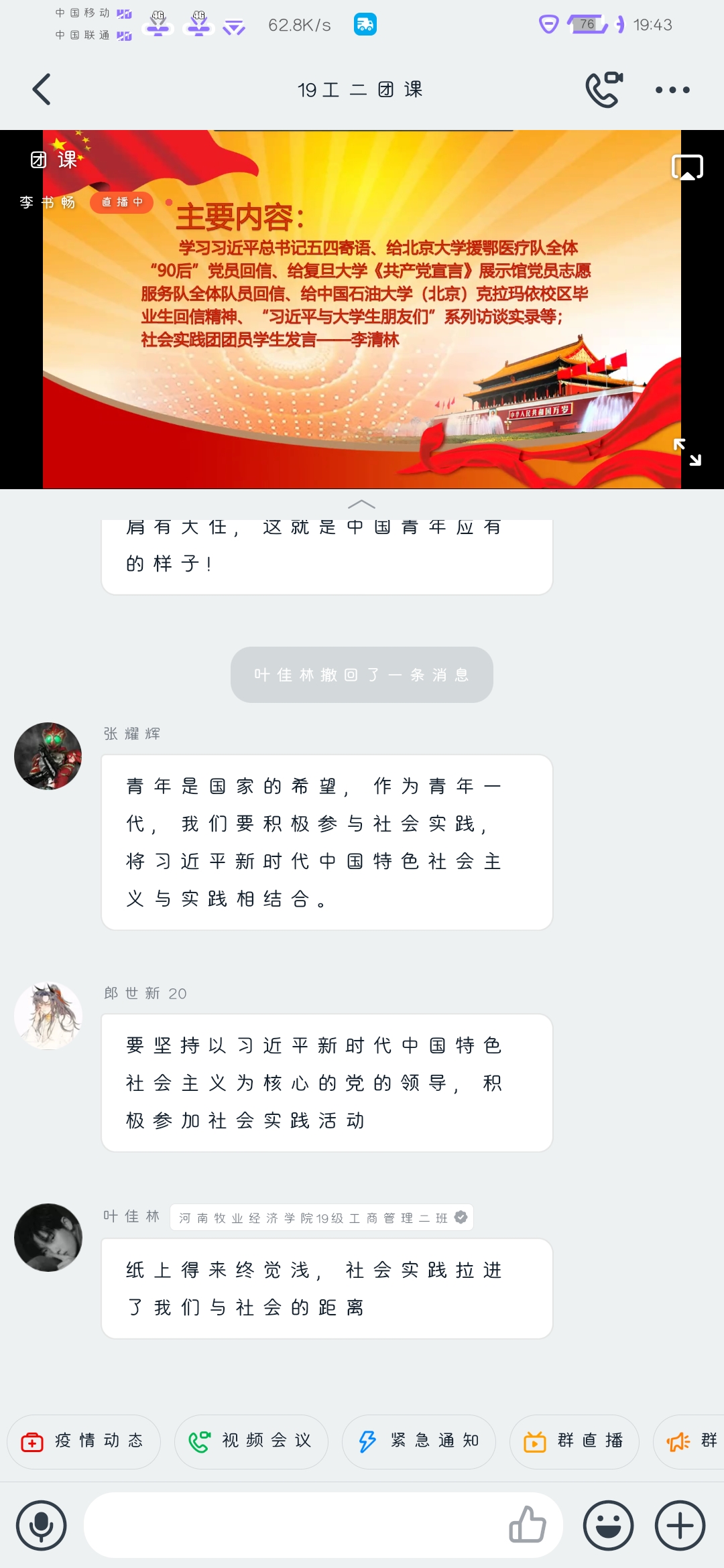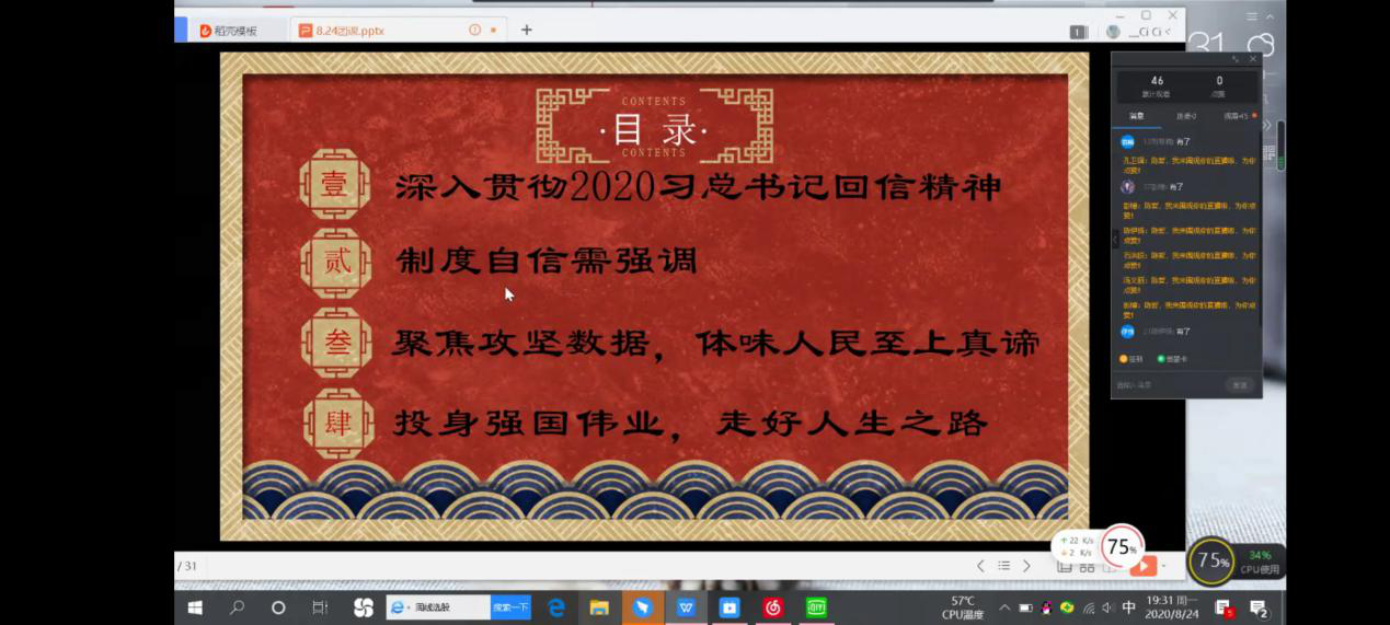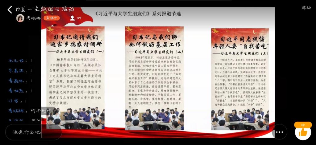 活动伊始,主持人带领同学们共同学习习近平总书记五四寄语、给北京大学援鄂医疗队全体“90后”党员回信、“习近平与老员工朋友们”系列访谈实录等;并组织同学们结合学习内容和社会实践积极发表观点;随后,主持人指出,通过深入的社会实践,团员员工更加易接受“沉浸式”精神洗礼,从内心深处打牢制度自信的根基,不断激发青春建功新时代的磅礴力量,积极投身新时代中。最后,主持人进行总结,而今中国的经济越和外面接轨,对于人才的要求就会越来越高,同学们不仅要学好公司里所学到的知识,还要不断从生活中,实践中学其他知识,不断地从各方面武装自我,才能在竞争中突出自我,表现自我。