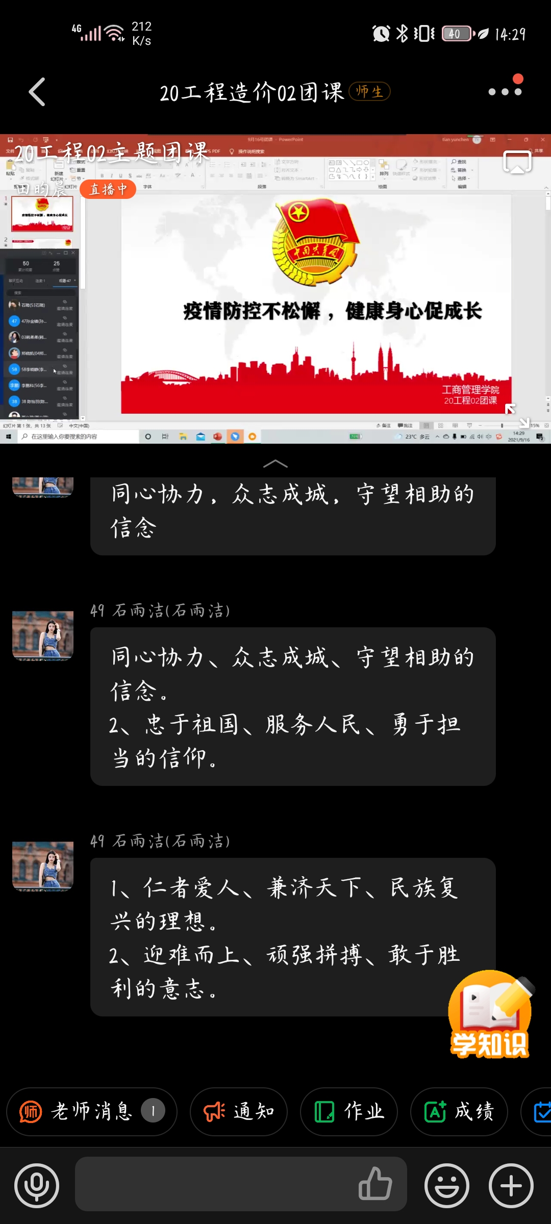 团课伊始,各班团支书带领大家再次回顾防汛抗疫相关事件,并组织班级内参加志愿活动的同学连麦发言,讲述自己的志愿经历,所有志愿同学通过踊跃分享,都获得了大家的称赞。团支书号召团员们向身边的榜样学习,把灾难当教材,上好防汛抗疫这堂人生大课。之后,团支书结合前期公司开展的“在校生思想状况调查”结果和本班同学的实际情况,引导同学们重视生命教育,自觉培养良好的居家学习生活习惯,调整身心健康状态。接着,各班以“居家学习生活”为话题展开讨论,针对同学们反映的困难和困惑,20物业01班组织委员表示我们应该互帮互助,结对帮扶,热爱生活,增强克服困难和战胜疫情的信心与决心。还有不少热心同学在疫情防控知识、学习习惯养成、居家锻炼技巧和心理健康调适等方面提出了自己的建议和方法。团课井然有序、氛围融洽。