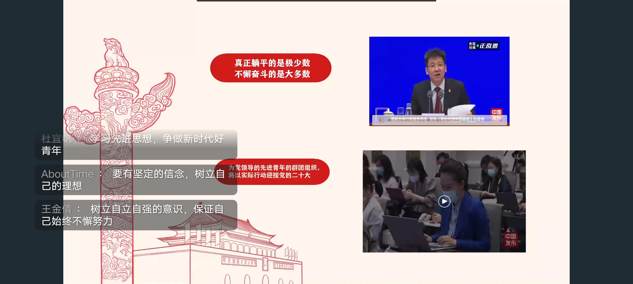 青春喜迎党的二十大,高举团旗跟党走。通过学习本次团课,同学们对五四精神有了新的认识,作为时代青年,我们要以实现中华民族伟大复兴的中国梦而奋斗,以实际行动迎接党的十二大胜利召开。