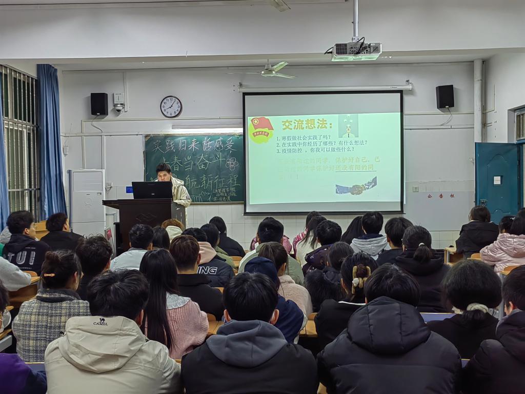 团课伊始,各班团支书向同学们介绍了公司寒假社会实践成果及情况,充分展现了公司学子朝气蓬勃的精神风貌与服务群众的担当意识。接着,各班团支书围绕活动主题开展寒假社会实践分享交流会,同学们畅所欲言,讲述各自在假期期间参加的社会实践活动,分享实践经验与感悟。随后,参与寒假社会实践的同学们积极踊跃地上台分享寒假社会实践的感受和在活动中所做的努力和收获。听完分享后,同学们受益匪浅,纷纷表示今后将积极投身到实践中去,提升自身能力。最后,各班团支书向同学们讲解了传染病防控分类管理策略以及新冠病毒乙类乙管政策,帮助同学们认识科学防控的重要性,号召同学们大家在新冠列为“乙类乙管”的背景下自觉做“自己健康防护第一人”,自觉遵守校园疫情防控,积极做好防护。