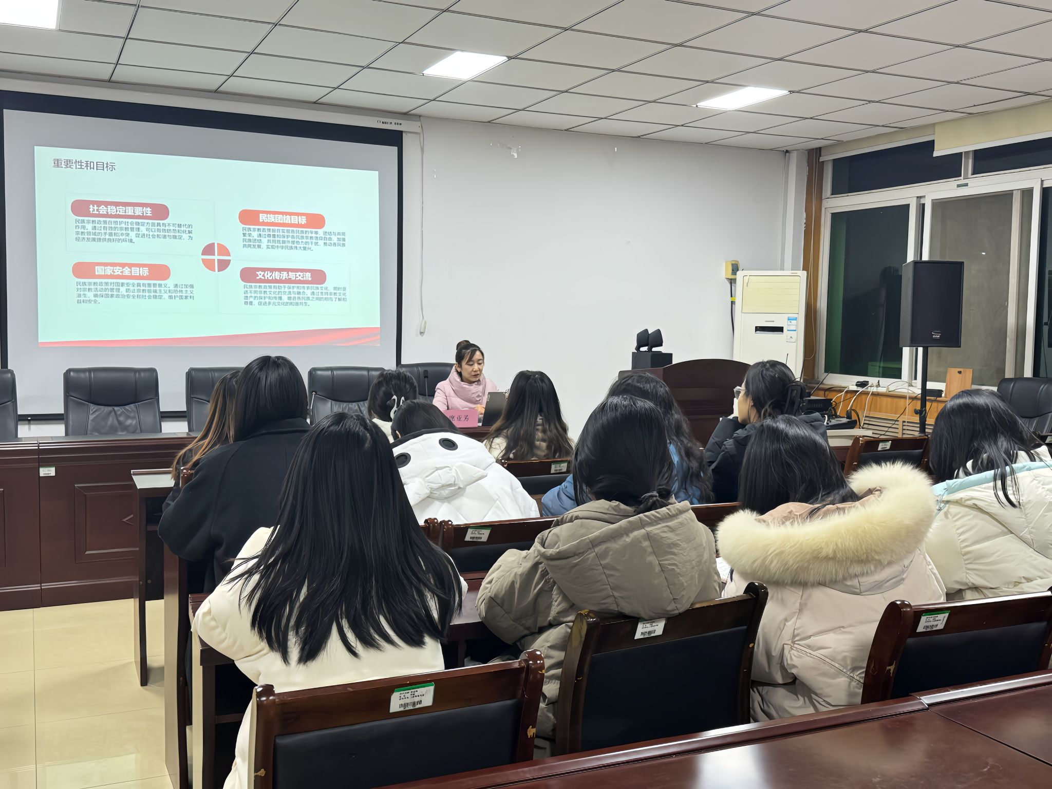 培训伊始,席亚芳老师系统讲解了我国民族宗教政策的基本框架与核心要点,从民族平等、民族团结、各民族共同繁荣发展的基本原则,到宗教信仰自由政策的内涵与边界,帮助团支书们构建起全面的知识体系。随后,席亚芳老师结合实际案例,详细阐述了民族宗教工作在基层的重要性,使团支书们深刻理解了民族宗教政策在现实生活中的具体应用。最后,席亚芳老师播放了一段有关民族宗教政策的视频,引导团支部书记深刻认识铸牢中华民族共同体意识的重大意义,自觉树立正确的国家观、民族观、历史观、文化观和宗教观,以理性思维和科学精神看待宗教问题,自觉遵守民族宗教政策法规,做坚定的马克思主义信仰者和实践者。