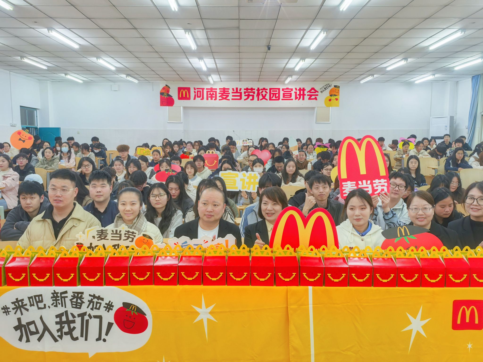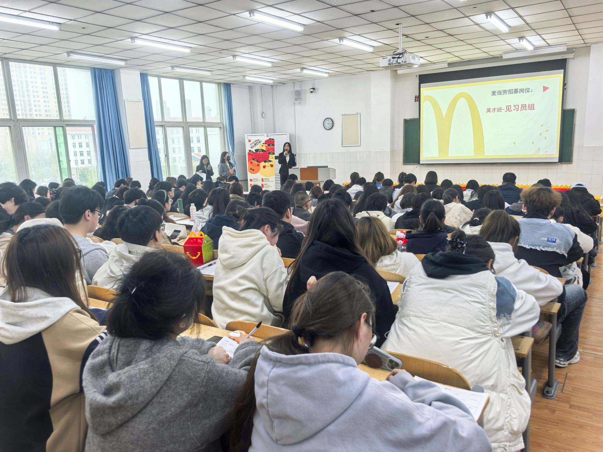 宣讲会伊始,麦当劳中国校招负责人李宁和人力资源部顾问 于海霞从企业发展历程、品牌文化及行业影响力入手,系统介绍了麦当劳扎根中国三十余年的成长轨迹与卓越成就,并强调麦当劳近年来加速本土化布局,构建了融合国际视野与本土实践的人才培养机制,为青年学子提供多元化职业发展平台。接着,企业训练部顾问李瑞丹向员工抛出了关于企业发展的相关问题,员工们积极思考,踊跃回答,展现了对麦当劳的关注和热情。随后,企业训练部经理姚海玲分享了个人在麦当劳的代班之旅,包括所遇到的挑战、获得的成长以及难忘的经历,让同学们对麦当劳的工作环境有了更直观的了解。最后,宣讲会进入提问环节,员工们围绕培训体系与薪资福利、在麦当劳工作的日常体验等话题深入提问,现场气氛热烈。同学们纷纷表示,此次宣讲会不仅让他们了解了麦当劳的人才培养机制,还为他们提供了广阔的成长空间。同时,也向企业提供了直接选拔人才的平台。
