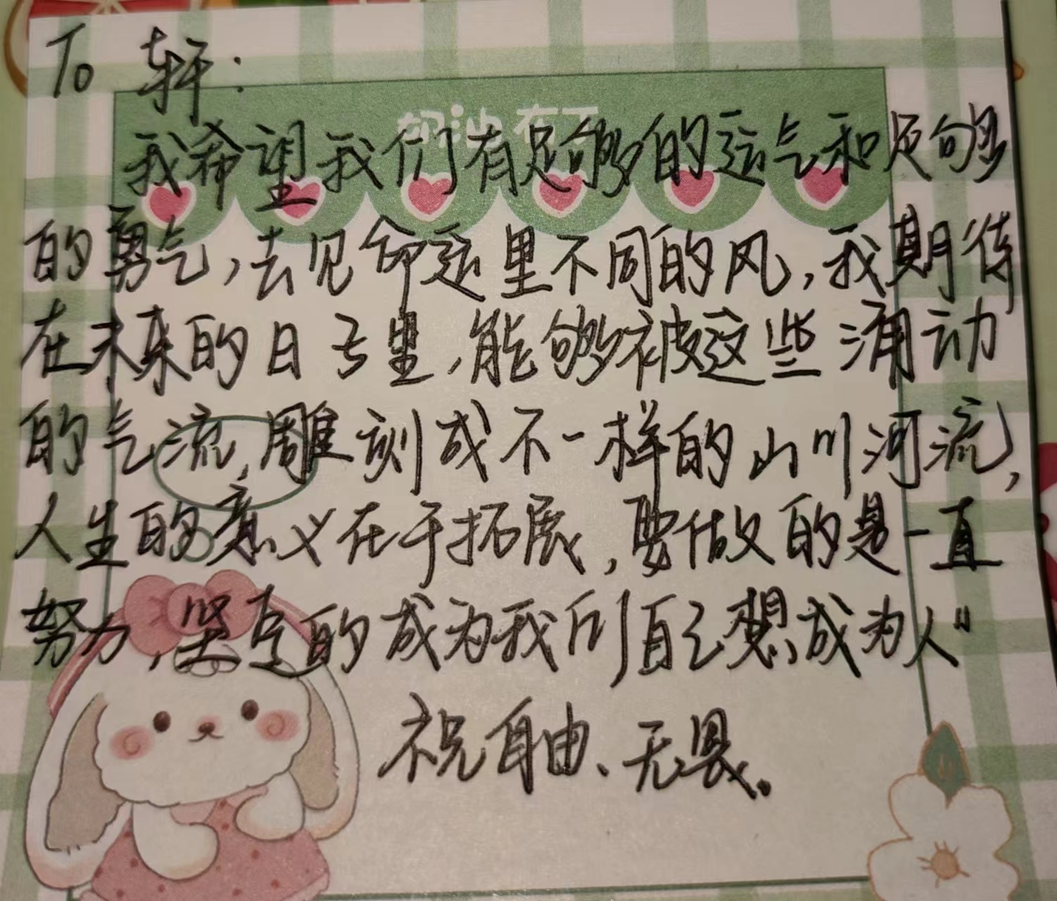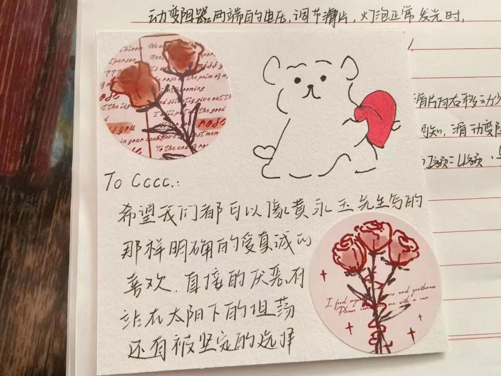 23工程01班张启同学以真挚的情谊给身边的朋友手写问候的卡片,表达自己的关心和祝福,既联络了彼此的感情,又把爱传递给对方。张启同学的做法帮助同学们学会珍惜友谊,直言感情。