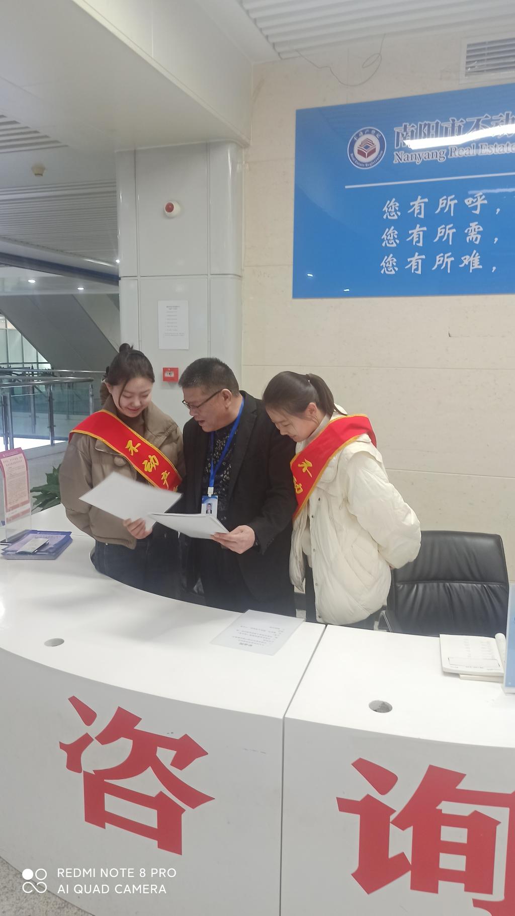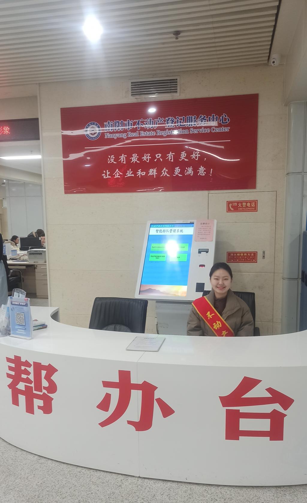为更好地了解和体验基层政务工作,23国际商务01班刘奕林同学主动申请成为河南省南阳市行政服务大厅办证专区的一名志愿者,协助群众在自助区查询不动产证,帮助产权人提交交易过户的必要要件。