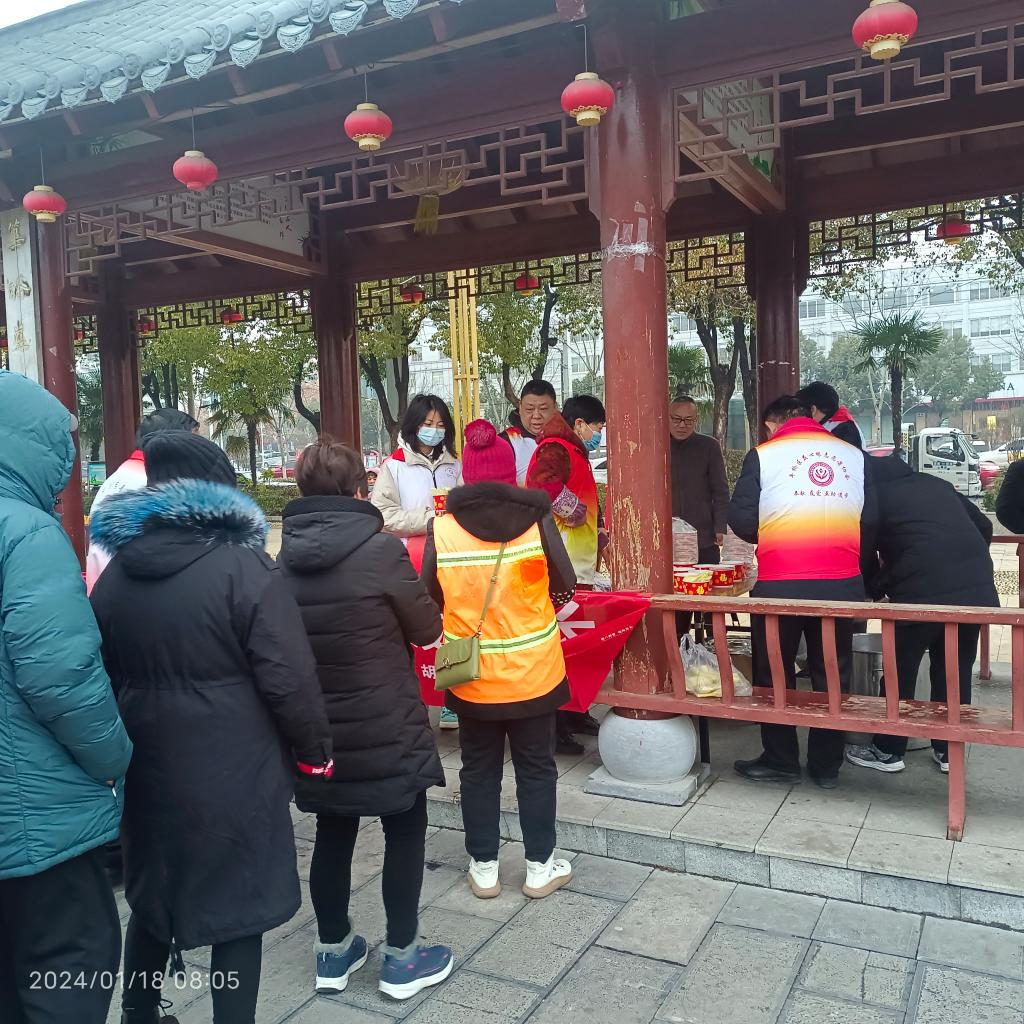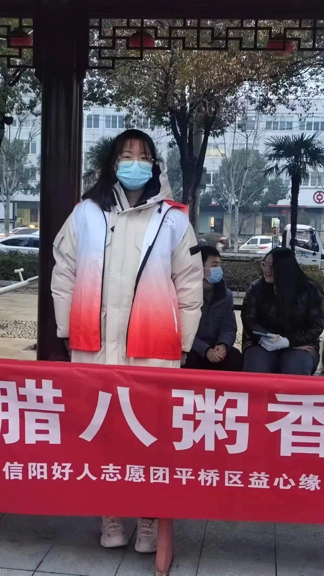 为了弘扬中华民族传统文化,传递社会爱心,22市场营销02班代慧君同学主动申请在信阳市平桥区益心缘志愿者协会担任志愿者,协助协会为市民发放腊八粥。