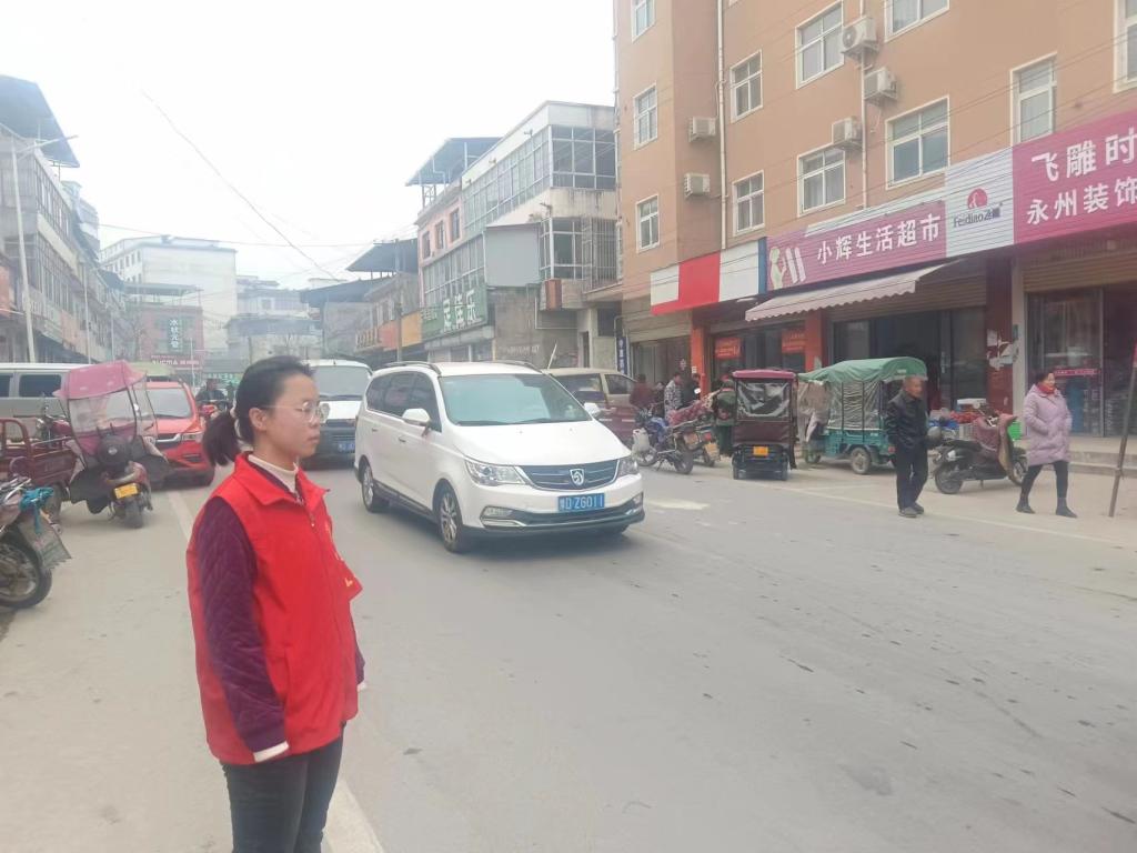 李雯禹同学主要负责在上下班高峰期引导车辆和行人有序通过,发现有堵塞情况时,她及时前往并指引车辆有序通过,提醒行人靠路边走,不要占据车行道等。