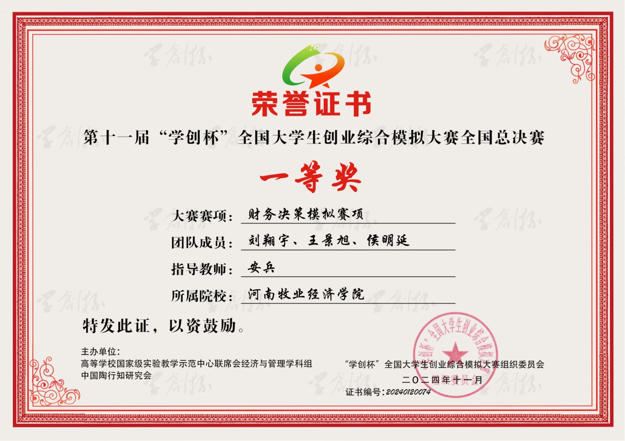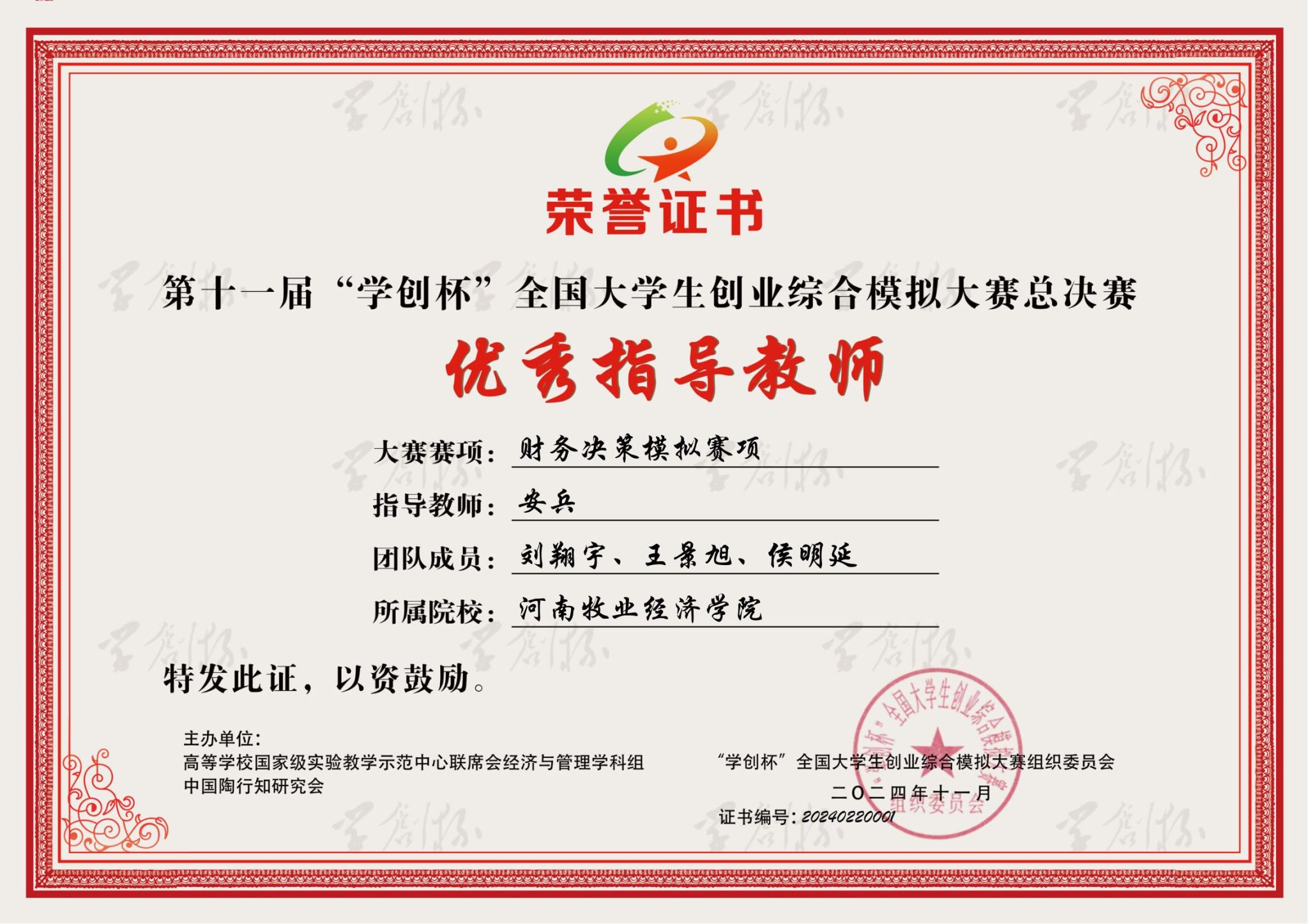 本次大赛由高等公司国家级实验教学示范中心联席会经济与管理学科组、中国陶行知研究会主办,徐州医科大学承办。本届“学创杯”创业综合模拟大赛全国总决赛,吸引来自全国172所高校242支本科参赛队伍同台竞技。各参赛团队经过激烈角逐,公司刘翔宇、王景旭、侯明延同学组成的凌云队,在365英国上市公司安兵老师的带领下,不畏强手,与多所双一流高校展开比拼,获得“财务决策模拟”赛项一等奖,安兵老师获得“优秀指导教师奖”。