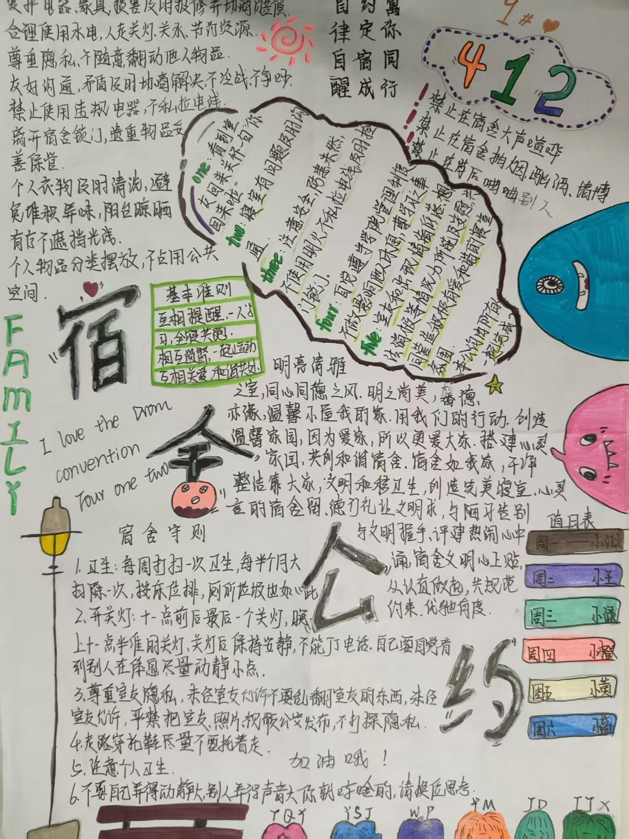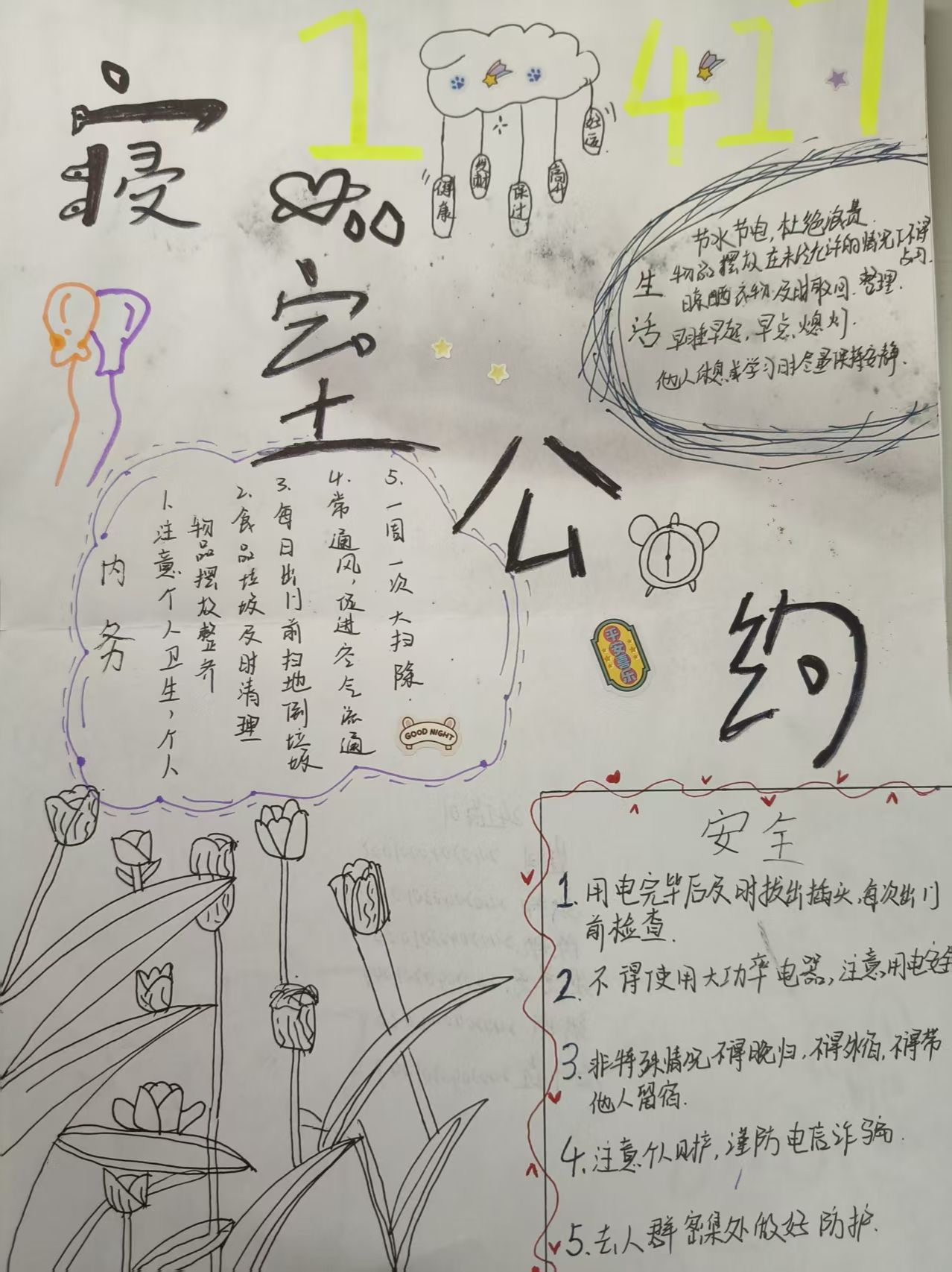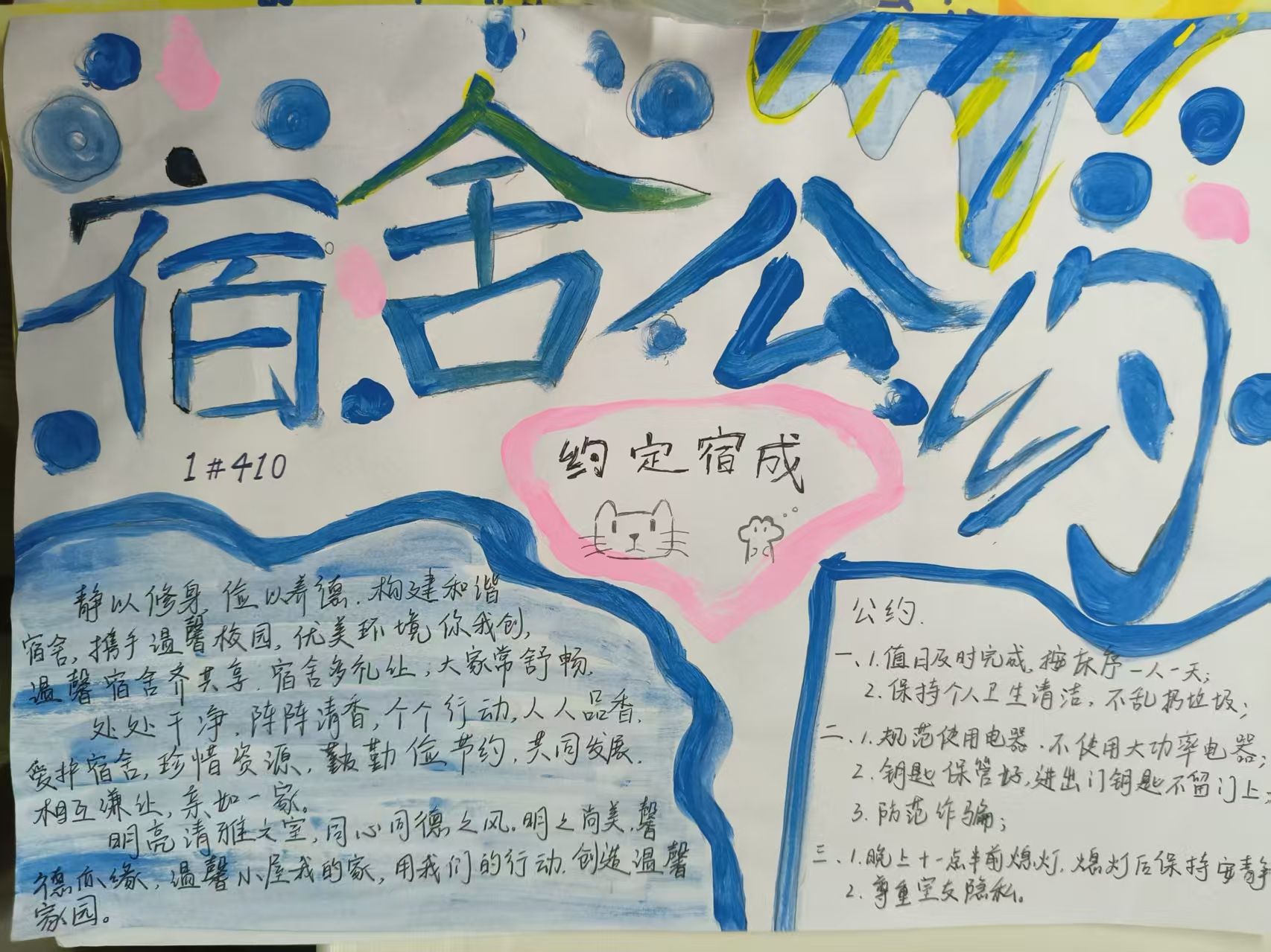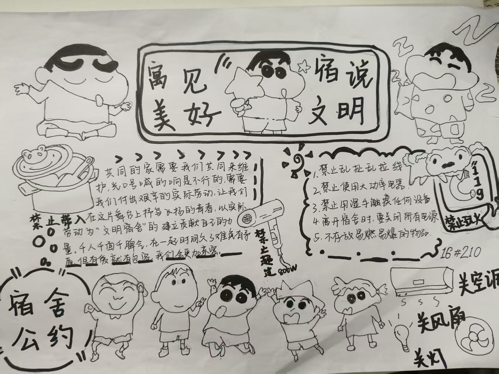 活动期间,各宿舍围绕文明、安全、和谐等主题,通过文字撰写与艺术创作双轨并行的方式,将公约内容具象化呈现。文字类作品逻辑清晰、条理分明,系统阐释宿舍管理规范;绘画类作品则以灵动笔触勾勒文明图景,展现出青年学子丰富的想象力。各宿舍长充分发挥“头雁效应”,组织成员深入研讨,通过民主协商、意见征集,形成贴合实际、操作性强的公约条款,确保制度既体现集体意志,又兼顾个体差异。经评选,多份优秀作品脱颖而出。这些凝结集体智慧的宿舍公约,不仅成为规范日常行为的"说明书",更化作维系舍友情谊的"连心桥",有效化解潜在矛盾,推动形成互相尊重、团结友爱的宿舍氛围。
