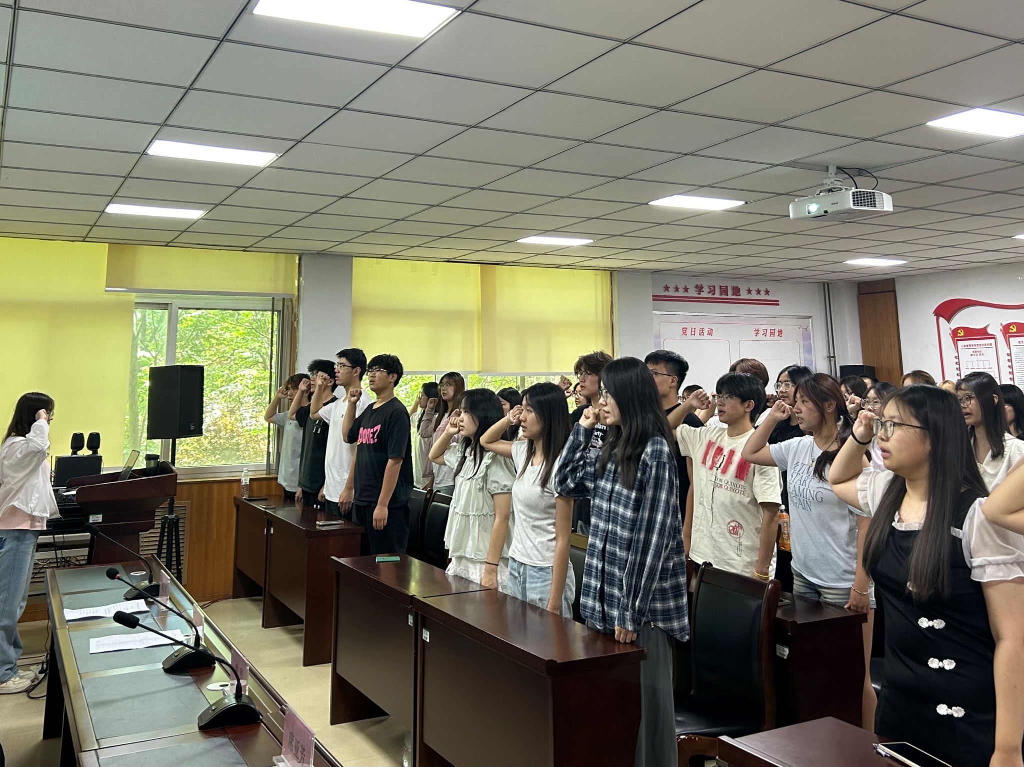 入团仪式在庄严的国歌声中拉开帷幕。贾雪宣读新团员名单,席亚芳为优秀新团员代表颁发团徽与团员证。这不仅是光荣的象征,更承载着共青团员的责任与担当。接着,新团员李孟雨作为代表发言,号召新团员跟随时代步伐,以赤子之心筑牢信仰之基,用实干担当扛起时代之责。随后,全体新团员起立,在领誓人带领下,面向团旗庄严宣誓。宣誓完毕后,大家齐声高唱团歌。最后,詹珅作总结讲话,对新团员们表示祝贺,并勉励大家以今日为新的起点,严格要求自己,为团组织贡献青春力量,主动学习党的创新理论,坚定理想信念。
