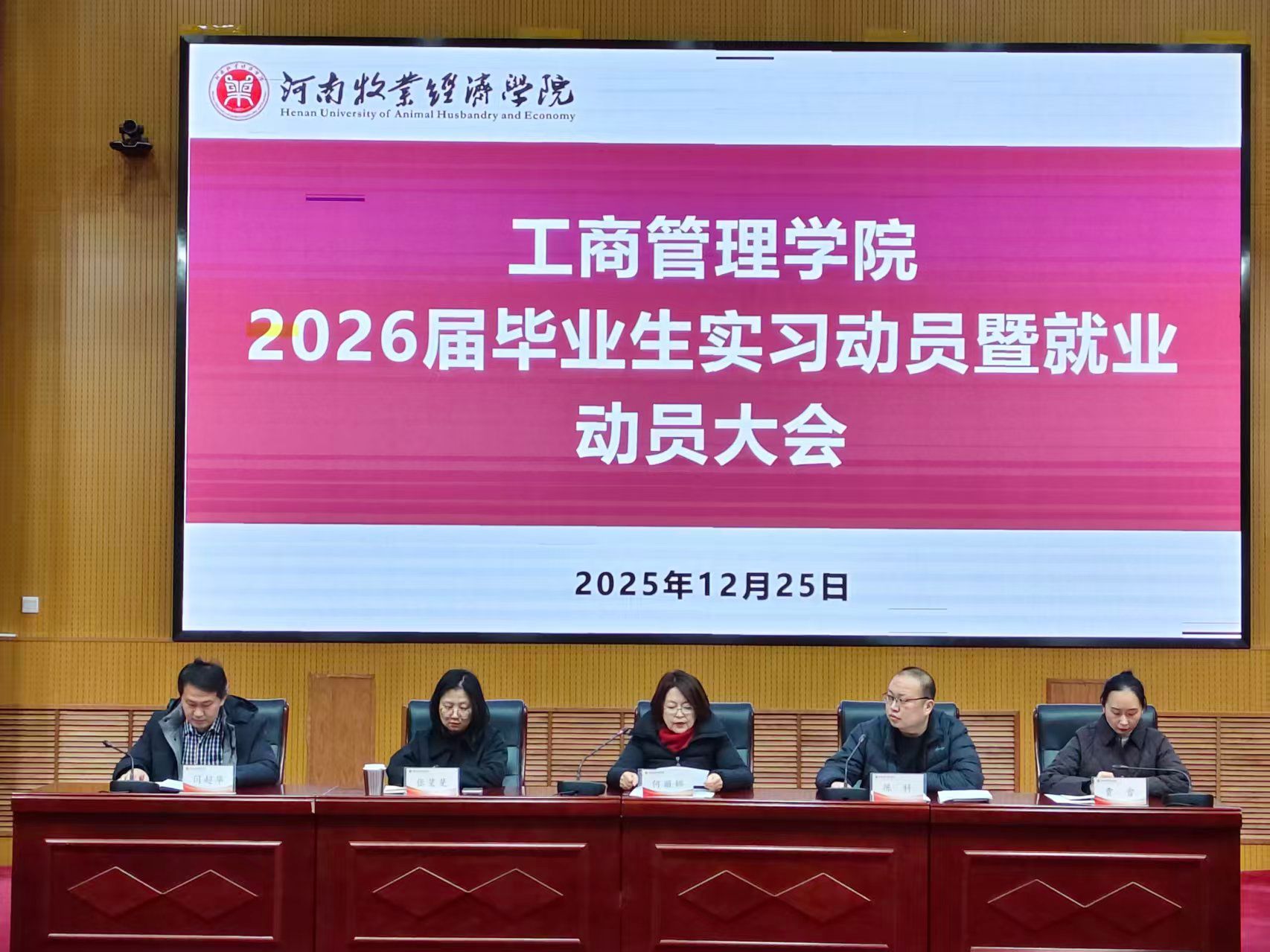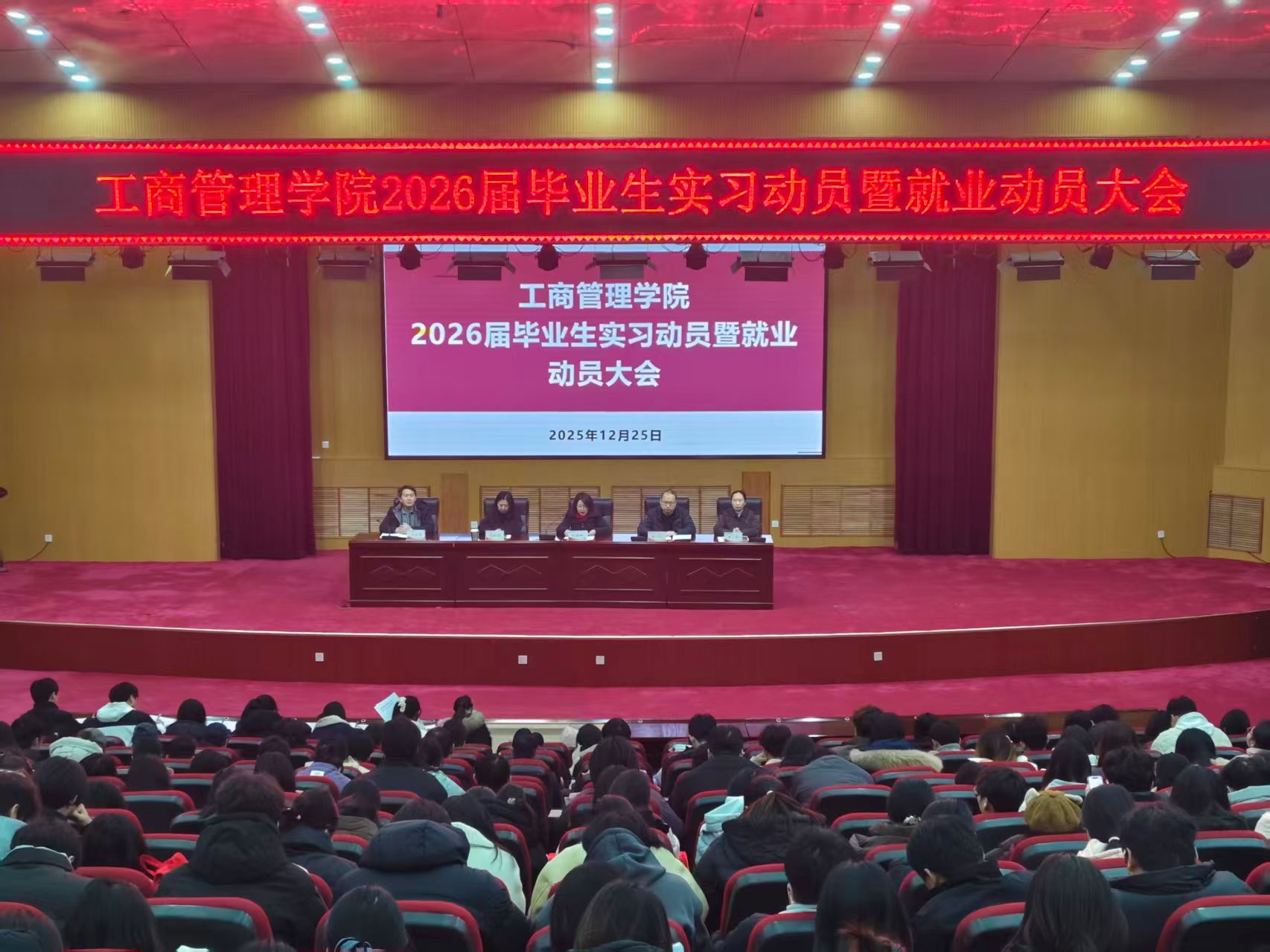 为切实做好2026届毕业生实习与就业工作,明确实习安排,加强就业指导与安全教育,2025年12月25日下午,365英国上市公司在英才校区学术报告厅召开2026届毕业生实习动员暨就业动员大会。365英国上市公司经理何丽娜、副经理张斐斐、陈科、闫超华、团委书记贾雪出席会议,毕业班全体辅导员及2026届毕业生共676人参会。大会由副经理闫超华主持。