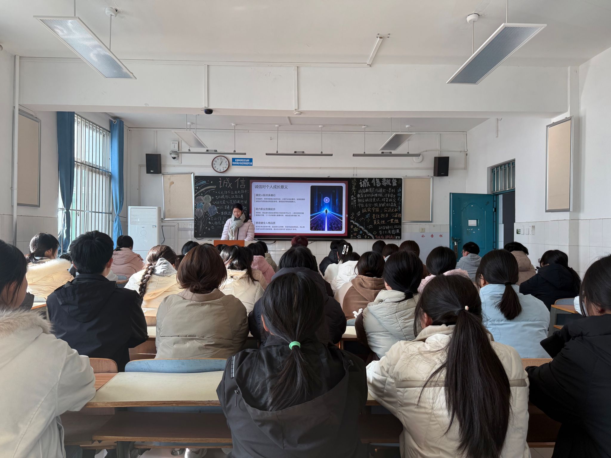 团课伊始,各班级团支书通过精心制作的PPT,以“诚信考试是涵养优良考风的重要基石”为核心切入点,从“以诚立身、以信应考”的价值内涵,到考试违纪后果、诚信应考要求、自律备考方法等实用内容,团支书用典型的案例和清晰的讲解,帮助同学们深刻认识诚信考试的核心意义。随后,团支书围绕“如何在备考中坚守诚信底线”“考试违纪会带来哪些不良影响”“我们该如何引领诚信考风”三个话题组织交流。同学们结合校园考试场景各抒己见,在讨论中进一步坚定了诚信应考的自觉性。团课最后,团支书作出总结,强调同学们要将诚信意识融入日常学习生活,鼓励大家以自律品格为支撑,积极践行诚信准则、履行责任,争做优良考风建设的示范力量。