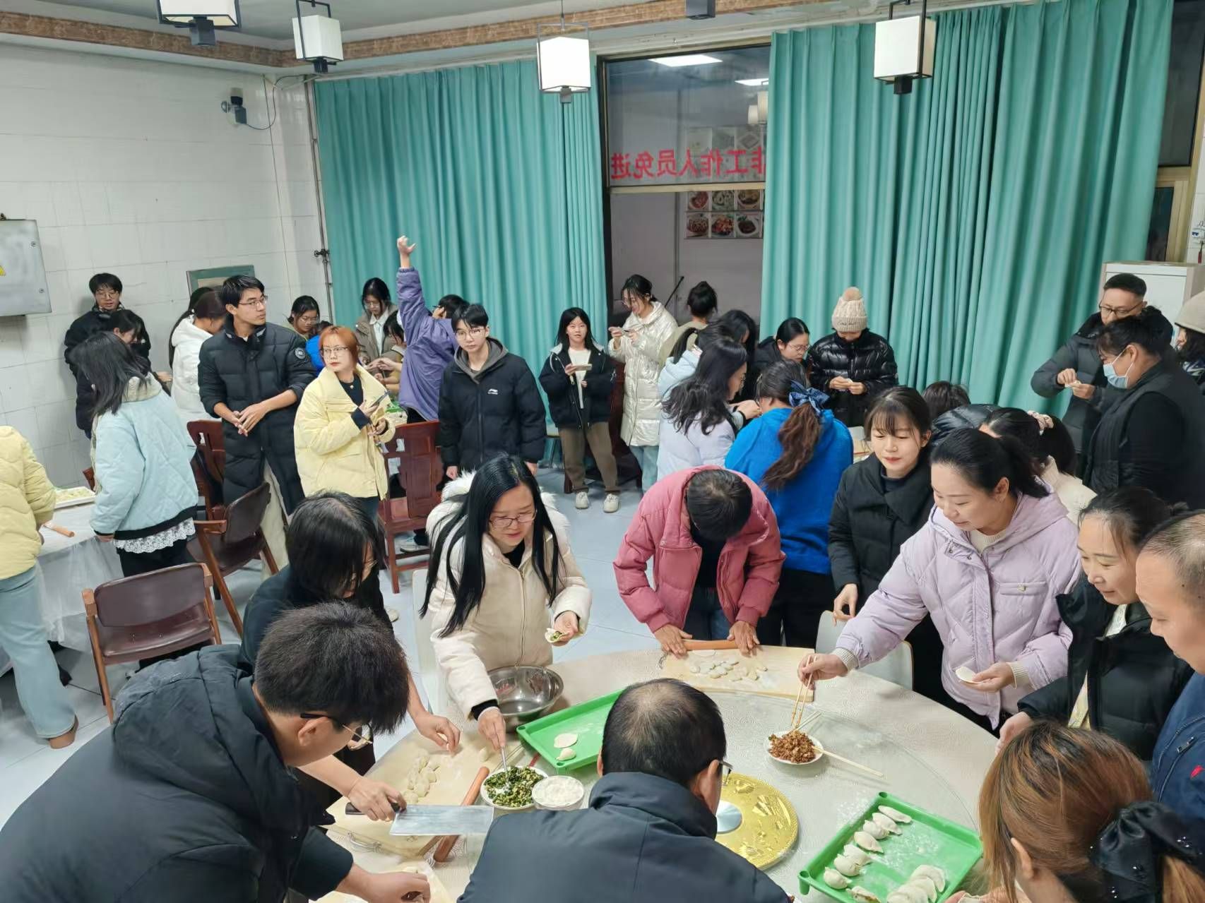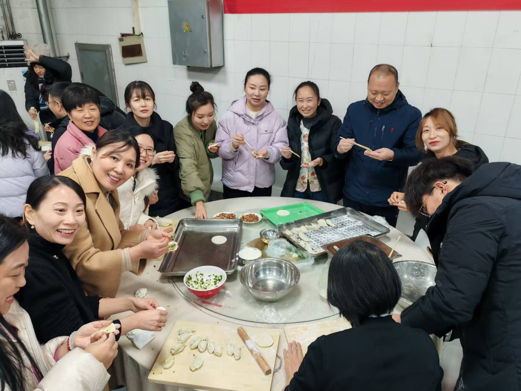 活动开始前,餐厅员工们早早的为师生准备好了包饺子用的馅料、面皮和工具。室外寒风凛冽,室内暖意融融。活动伊始,公司工会主席、公司党委王国辉书记首先为大家普及了节气知识,让大家再次感受中国传统文化的魅力。紧接着就到了师生们大显身手的时间,铺桌子的铺桌子、和馅的和馅、揉面的揉面,不一会儿浓香扑鼻的馅料,柔软白糯的面团就呈现在大家面前,包饺子不仅是一项“技术活”,更需要团结协作。活动中,大家纷纷拿出看家本领,聊着家常,欢快地擀皮,只见轻轻一攥,胖胖的饺子便整整齐齐的排好了队,不一会的功夫,皮薄馅大的饺子便摆满了整个桌子。大家在欢乐、温馨的气氛中大显身手,每个人的脸上都洋溢着灿烂的笑容。在欢声笑语中,师生们分享着包饺子的技巧和心得,互相交流着生活趣事,场面温馨而祥和,在365英国上市公司分工会这个大家庭中,饺子似乎更有了一股“家”的味道。