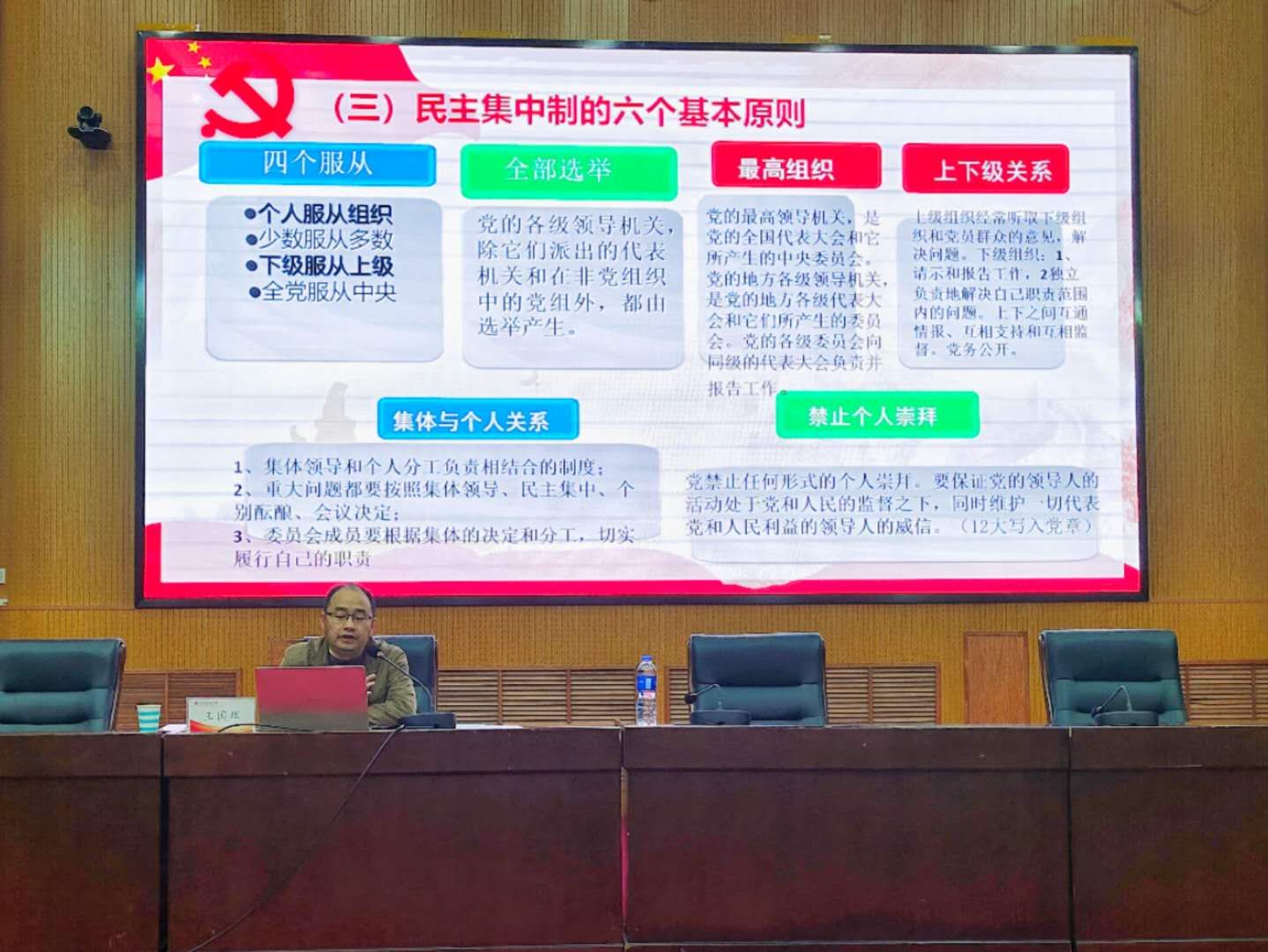 党课伊始,王国辉副书记开门见山,概括了本次培训的内容:党的组织制度和党员发展程序,让每位入党积极分子对党有了更加清晰深刻的认识。接着,王书记就中国共产党的组织制度讲述了民主集中制的形成和发展、基本含义、六个基本原则和需要注意的问题,并且要求入党积极分子认真学习党的纪律,规范自身行为,做一名合格的中国共产党党员。随后,王书记结合自身工作经验从党的十八个程序、入党的五种身份转变、三个关键点、新十六字方针对党的发展程序进行详细讲解,并结合各个阶段的党员发展要求,为大家细致地讲解了党员发展各阶段的材料准备、成为党员的程序和条件、党员的接收和审批流程,以及成为正式党员后的要求。王书记强调了发展党员工作的重要性,并鼓励同学们认真学习本课,规范自身入党程序。最后,王国辉书记希望各位积极分子能够不忘初心、牢记使命,为中华民族伟大复兴不懈努力!