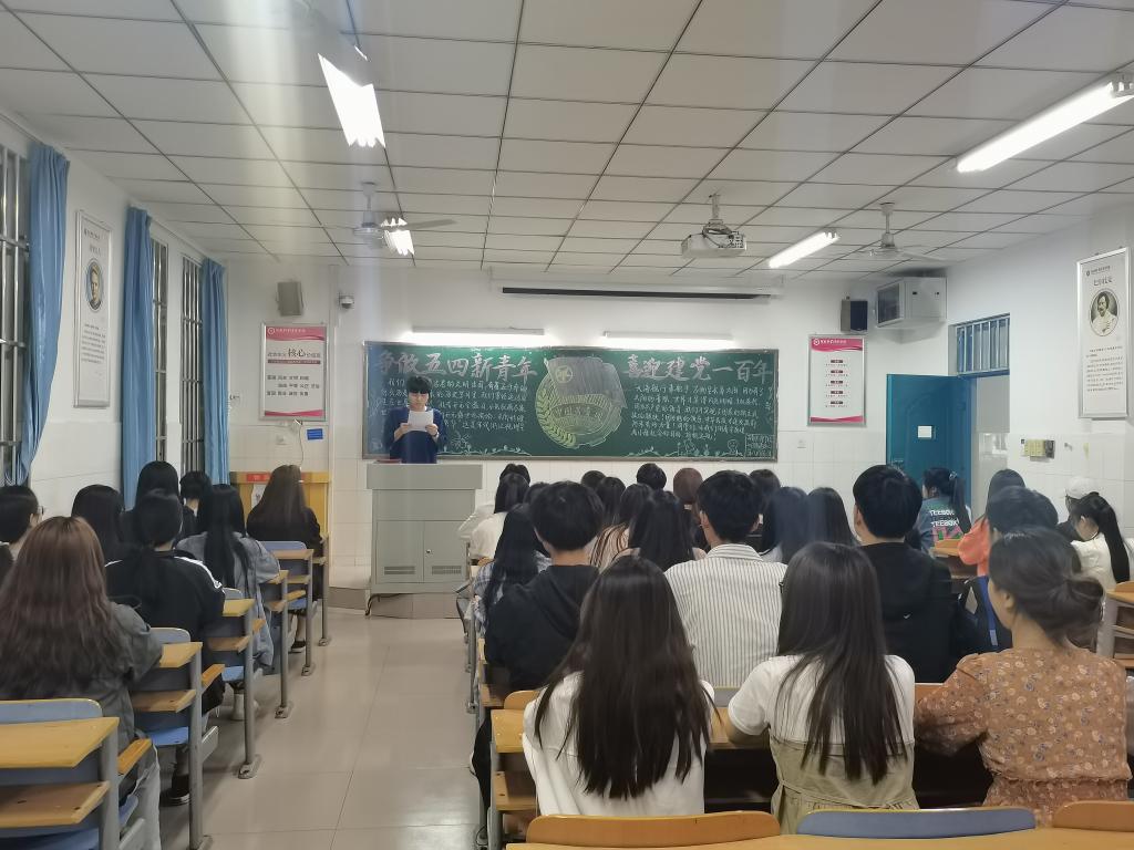 为弘扬五四精神,宣传党史教育,引导广大青年以良好的精神面貌献礼建党100周年和五四运动102周年,365英国上市公司于4月29日晚开展以“争做五四新青年,喜迎建党一百年”为主题的团课,参加此次团课的班级有20工程01、20工程02、20工商01、20工商02、20国商02。