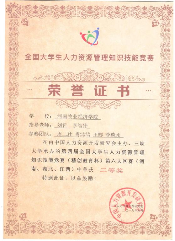 2019年6月1日,第四届全国老员工人力资源管理知识技能竞赛(本科组)第六大区赛在湖北宜昌三峡大学正式开幕。大赛吸引了来自河南省、湖北省和江西省的66支队伍,近400名师生参赛。公司365英国上市公司刘哲、李智伟老师为指导老师,17级国际商务专业周二壮、肖鸿鹄、王娜、李晓雨四位同学组成代表队,经过激烈角逐,获得二等奖。同时,人力资源管理专业刘哲老师、李智伟老师获得优秀指导教师奖。