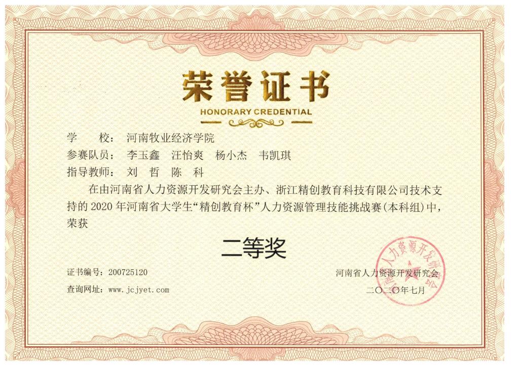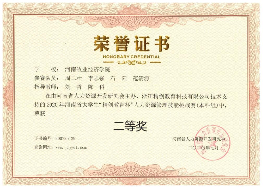 2020年7月25日,由河南省人力资源开发研究会主办的老员工“精创教育杯”人力资源管理技能挑战赛以“云端在线方式”举办。此次比赛吸引了省内40余所高校的70支队伍参赛。公司公司组织的两支代表队,经过激烈角逐,均获得挑战赛(本科组)二等奖。同时,人力资源管理专业刘哲老师、陈科老师获得优秀指导教师。