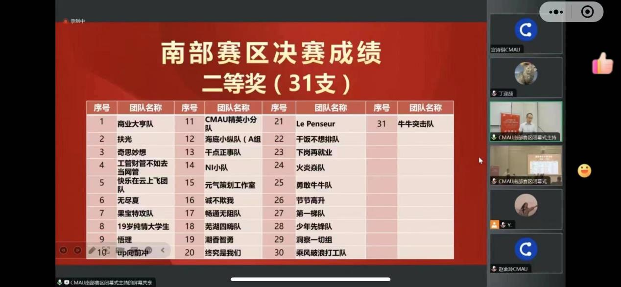 本次决赛由行业及校内专家担任评委,以匿名的方式参与评审。参赛队伍成员按照抽签顺序,依次上场进行PPT讲解展示并依次回答老师提出的问题,现场气氛热烈。经过紧张激烈角逐,最终评出一等奖三名、二等奖六名、三等奖八名,其中前四名的队伍最终获得晋级区赛的资格,“悟理”队与“畅通无阻”队代表公司在南部分区赛决赛中荣获二等奖。