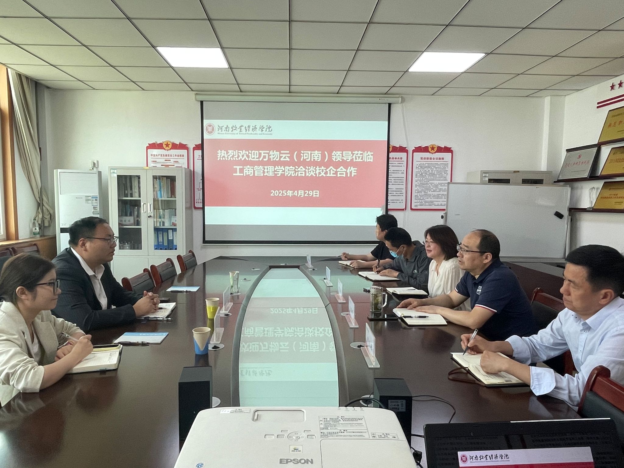 2025年4月29日,万物云(河南)物业服务有限公司代表王胜彬一行赴公司开展回访交流。公司党委书记王国辉、副经理(主持工作)何丽娜、副经理范森、陈先锋等领导热情接待并参与座谈。双方围绕深化产教融合、创新人才培养、拓展校企合作模式等议题进一步展开深入探讨,为未来协同发展奠定坚实基础。