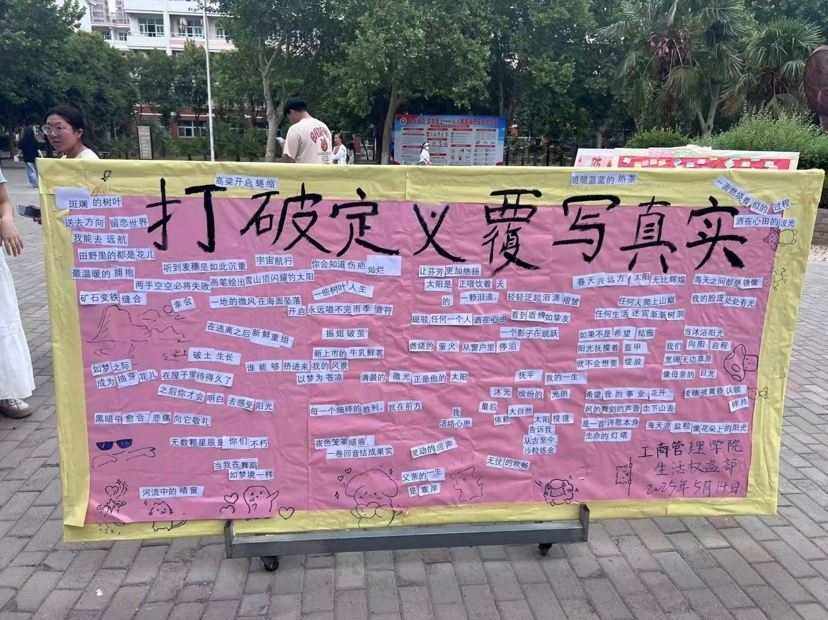 本次活动以“消除刻板印象,拥抱真实自我”为主题,搭建起一个打破偏见、展现真实自我的互动平台,吸引了很多同学们积极参与。参与者从现场提供的纸张中挑选心仪的句子和词语,通过裁剪、拼贴的方式,将内心对打破刻板印象的深刻思考与独特感悟,转化为一首首充满创意的小诗。这些作品不仅展现了同学们的创意,更传递出他们对真实自我的追求和对平等价值观的深刻理解。活动现场氛围热烈,同学们在交流与创作中,感受到了自我成长的力量,进一步明晰了自身价值,坚定了追寻个人发展道路的信念。