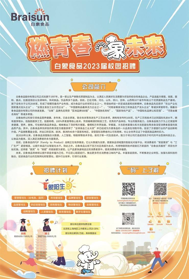 具体岗位可登录校招主站baixiangfood.zhaopin.com或搜索微信公众号“白象招聘”进一步了解。
