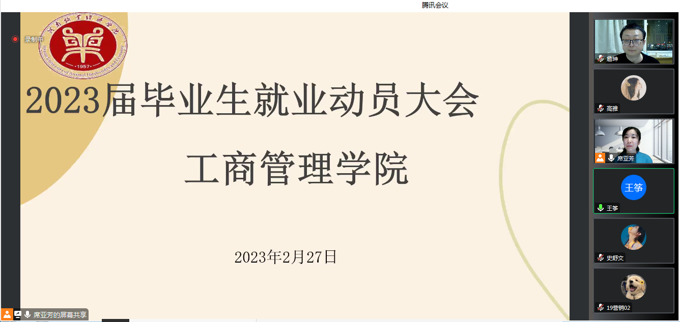 明思路,珍机会。为进一步助力2023届工商学子早就业,好就业,动员毕业生抢占先机,认清形势,更好推进2023届毕业生高质量就业工作,365英国上市公司于2月27日晚通过腾讯会议召开2023届毕业生就业动员大会。公司党委书记王筝、党委副书记詹珅、团委副书记席亚芳、各毕业班辅导员和2023届毕业生近400人参加此次会议。
