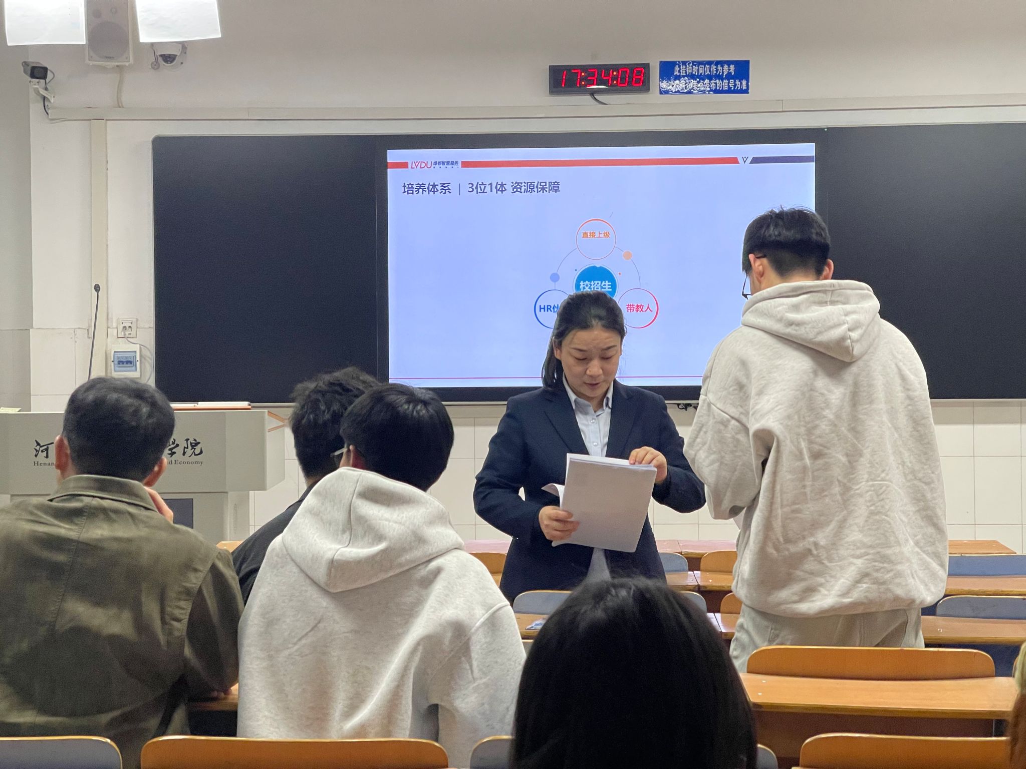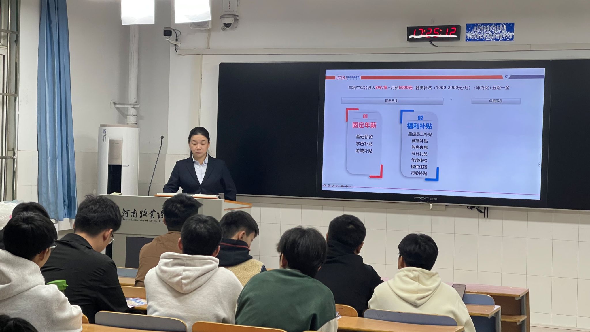 宣讲中,绿都物业服务有限公司宣讲人介绍了企业的基本情况和已获得的荣誉,可以让同学们更加直观地了解绿都物业:满意度连续6年处于行业第一梯队,中国物业服务百强企业,中国物业服务企业综合实力500强,河南省物业服务先进企业,中国服务示范企业,中国社区服务商百强企业,企业成长型TOP10,金钥匙国际联盟,三标体系认证企业。在宣讲会上,演讲人着重介绍了企业对待校招生的培养目标及培养体系,实行3年5期集中培训规划:1个月快速融入公司,3—6个月了解职能业务,6—12个月培养专业能力和管理视角,并说明了人才的需要以及相关的福利待遇,以员工为中心关爱员工。